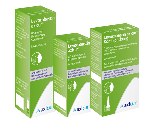 Antiallergikum/Antihistaminikum. Anwendungsgebiete: Bei Kindern ab 1 Jahr, Jugendlichen und Erwachsenen zur Behandlung von Beschwerden einer allergisch ausgelösten Entzündung der Bindehaut, z. B. Heuschnupfen oder dem sog. Frühlingskatarrh (Augentropfen) bzw. von allergischem Schnupfen, z. B. Heuschnupfen (Nasenspray). Nasenspray/Augentropfen enthalten Propylenglycol, Benzalkonium-chlorid u. Augentropfen zusätzl. Phosphate. Zu Risiken und Nebenwirkungen lesen Sie die Packungsbeilage und fragen Sie Ihre Ärztin, Ihren Arzt oder in Ihrer Apotheke. axicorp Pharma GmbH, 61381 Friedrichsdorf. Stand: September 2025